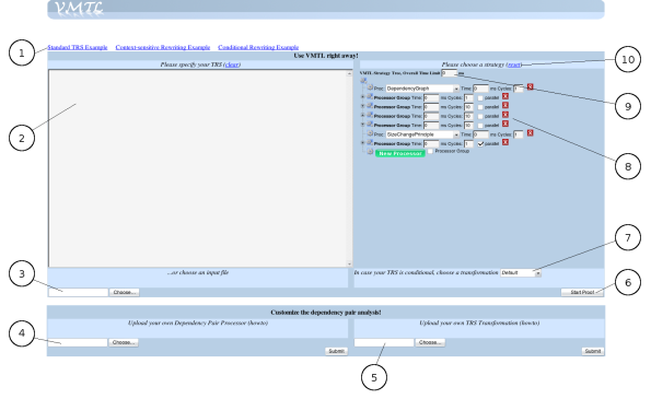 The web interface is an easy to use front end for the VMTL laboratory. It features graphic strategy manipulation, dynamic addition of custom dependency pair processors as well as TRS transformations (used for instance to transform conditional to standard TRSs) and convenient proof layouting. Figure 1 shows a screenshot of the web application.
